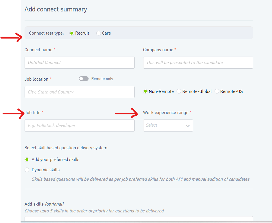 - Recruit : Selecting "Recruit" as the connect type is ideal when creating a connect for a specific job role, requiring mandatory input for the job title and work experience range fields. As shown in image below.