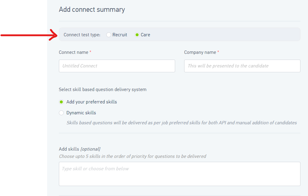 - Care : Opting for "Care" as the connect type is suitable when creating a connect not tied to a specific job role, allowing flexibility as the job title and work experience range fields are not obligatory. This choice is ideal for more general or non-job-specific interactions.As shown in image below.