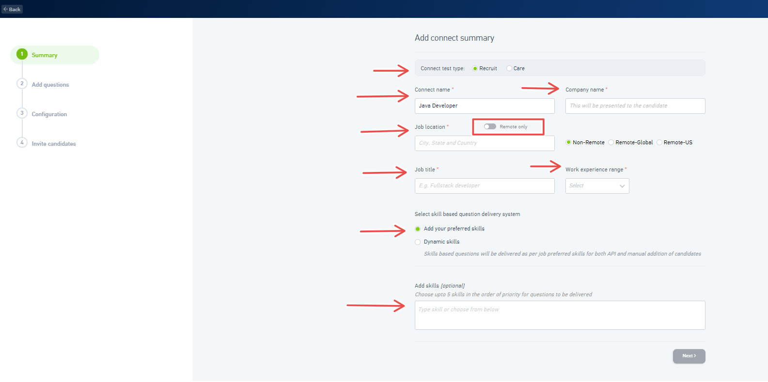 Click on the "Next" option, once done!- Skill Evaluation: Skills can be evaluated as the questions would be posted to the candidate from the question bank based on the skills preferred
