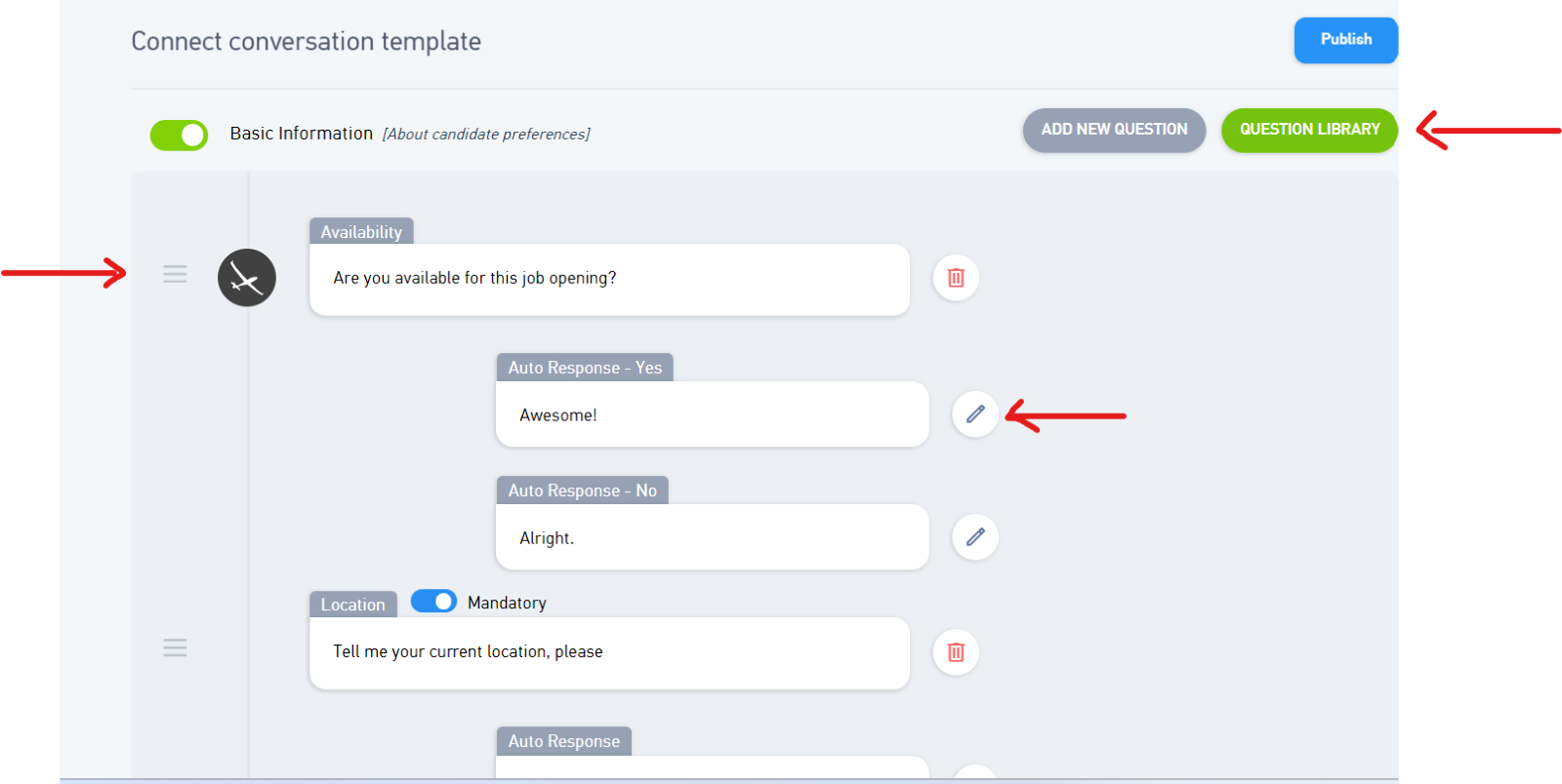 - Basic Information: To capture the candidates basic information, you can add relevant questions from the question library or author your own questions. Shuffle question orders and tailor auto-responses given to the candidate as shown in image below.
