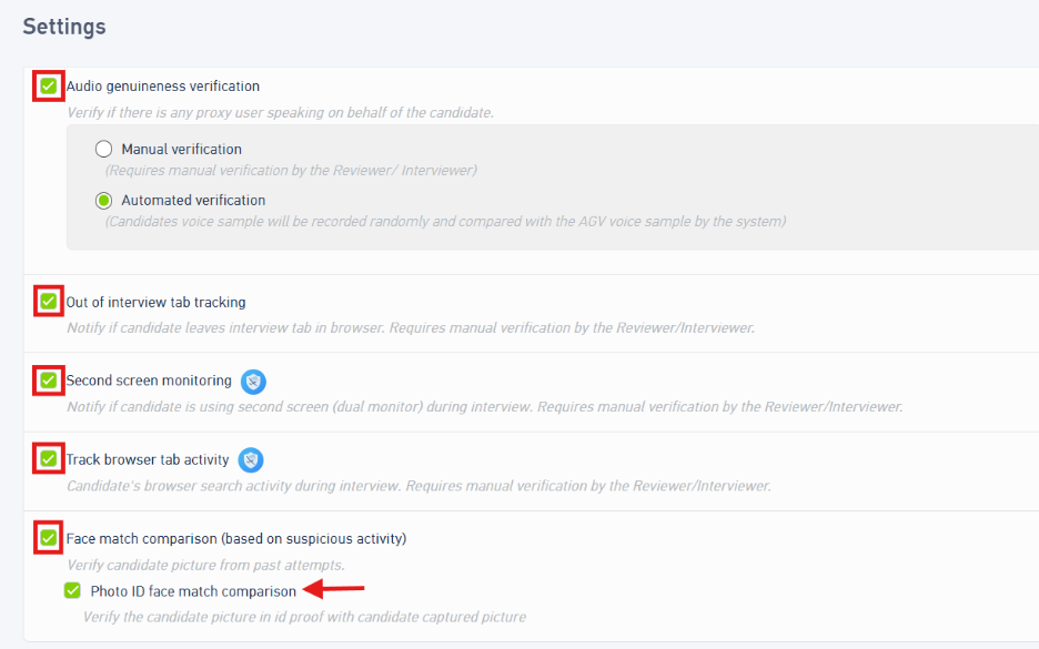 These settings help ensure the authenticity and fairness of live interviews by enabling various monitoring and verification features: