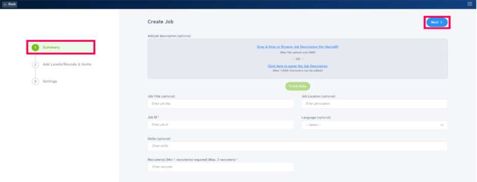 1. Provide the Job Description by either pasting the text or uploading the JD file.